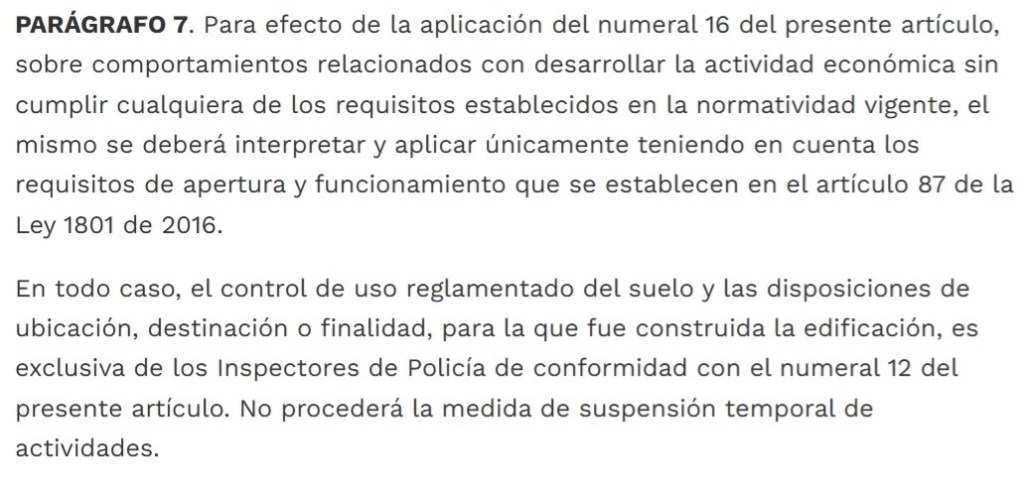 Esta norma aclara las competencias en materia de control de uso del suelo. Solamente los inspectores de policía pueden controlar y adelantar procesos de policía. Esta norma beneficia a restaurantes, bares, tiendas de barrio y billares.